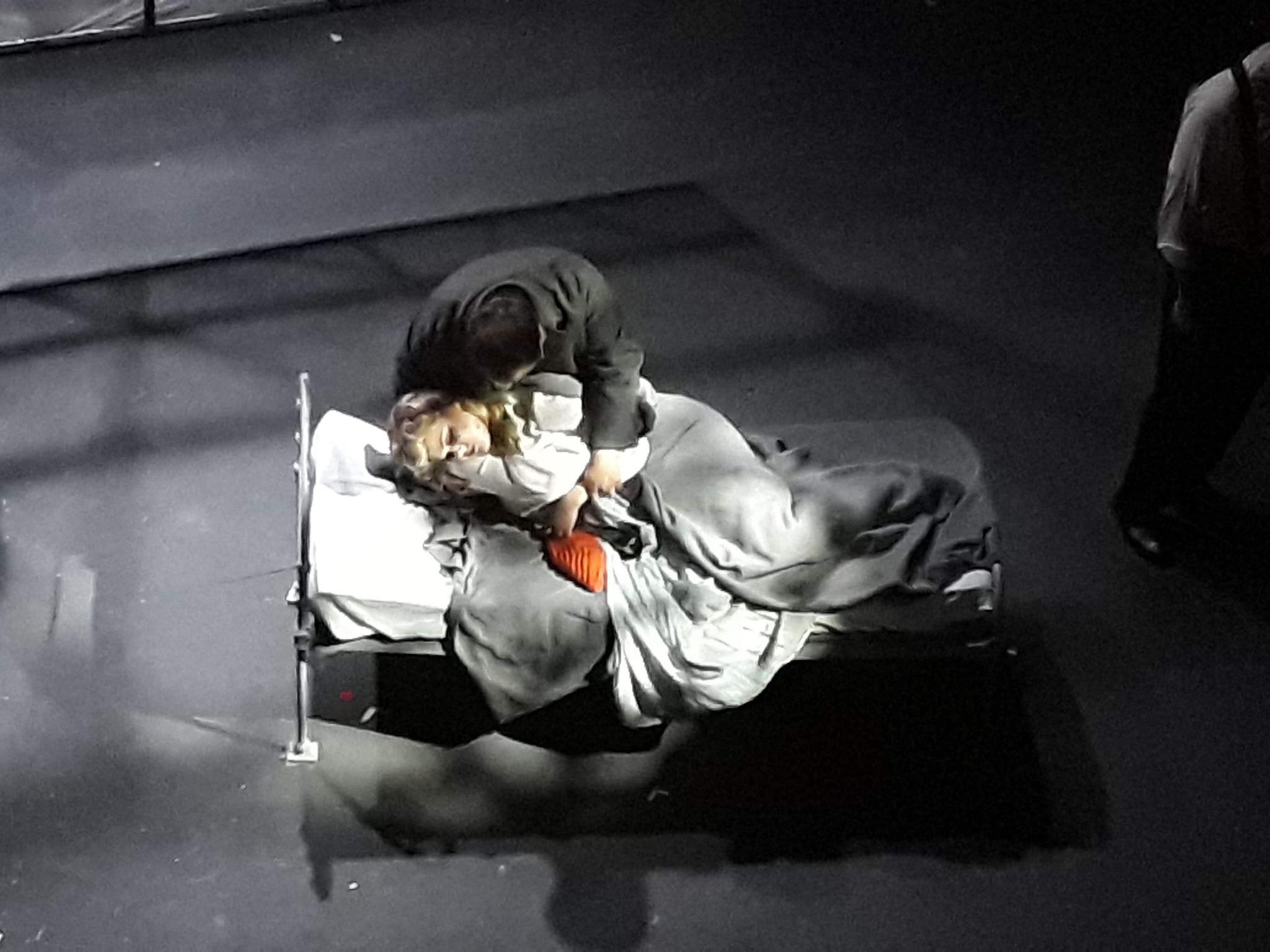 Obviously inspired by Baz Luhrmann’s famous 1990 production for Opera Australia, with a fair bit of OA’s recent HOSH production by Andy Morton thrown in for good measure, Doddrell’s vision is that of an impoverished, wintry postwar Paris. The references to the departing Nazis and the pain of war add a fresh element of drama and suffering to this, the most frequently trotted-out of operas. Marcello here is a returned serviceman, which makes some sense of his disturbingly violent behaviour towards Musetta, and there are visual references to Benoît being a Nazi, which somewhat excuses the young bohemians’ scurrilous attempts to get out of paying the rent. The main Baz Luhrmann elements here are in the set, designed by the multi-talented ‘Monet’ cast Rodolfo, Simon Castle. He and Doddrell have shamelessly borrowed Luhrmann’s iconic ‘Coca-Cola’-esque “L’amour” sign, which also prominently featured in Luhrmann’s 2001 La Bohème / La Traviata jukebox mashup film, Moulin Rouge! (You can watch the Act I love duet from Luhrmann’s La Bohème here.) As if it weren’t already attention-grabbing enough, Doddrell’s L’amour billboard here has a prop thrown at it that ‘breaks’ its light, and has a character ‘re-painting’ it in Act III. Frankly, I wouldn’t mind this cheeky postmodern appropriation at all if only Doddrell had given due credit, but Luhrmann’s name is nowhere to be found in the program notes. Instead, Doddrell cites Bressaï’s black and white photographs of Paris’s underworld as his visual inspiration. The set is certainly beautiful and iconic, and it is used very effectively in terms of blocking; Doddrell shows real talent in co-ordinating a large cast and creating interesting shapes and emotional variety. Like Luhrmann and Morton, he has made great use of a large, grubby, angled garret window, which descends from the flies, as does an ornate streetlamp in Act III. Café Momus is nicely rendered in Act II with chairs and tables and the artists’ chalkboard, which is flipped to reveal the name. In Act IV, the chalkboard is home to Marcello’s painting, which is a bizarrely floppy canvas that is barely held up properly (so easy to fix—why?). A single bed completes the set, and this potent image of l’amour itself is bounced on riotously by the bohemians in Act IV before the entrance of the girls, whereupon it is the site for Mimì’s tragic end.